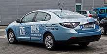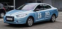 The Renault Fluence Z.E. is an electric version of the Renault Fluence compact sedan, part of the Renault Z.E. program of battery electric vehicles. It was unveiled by Renault at the 2009 Frankfurt Motor Show.[2] The Fluence Z.E. is outfitted with a 22 kWh lithium-ion battery which allows a total all-electric range of 185 km (115 mi) measured on the NEDC combined cycle, with speeds up to 135 km/h (84 mph).[3]