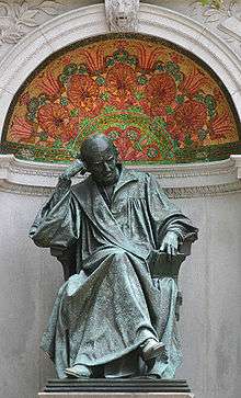 Niehaus was a German-American from Ohio who attended the Royal Academy in Munich. In 1881, the Ohio state government commissioned him to create a statue of the recently assassinated President James A. Garfield. He moved to New York City in 1887 and opened a studio where his works included the pediments at the Appellate Division Courthouse of New York State and the doors of Trinity Church. Niehaus was best known for his portraiture work, including eight statues for the National Statuary Hall Collection in the United States Capitol and two works for the Thomas Jefferson Building's Main Reading Room. His statue of John Paul Jones in Washington, D.C. is listed on the National Register of Historic Places (NRHP).[3] Niehaus created Hahnemann's likeness by using a bust sculpted by David d'Angers that is now housed in the Saint Jacques Hospital in Paris.[4]