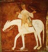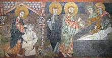The hermitage housed many fine Romanesque frescoes from about 1125; most of these have been removed, but some have remained. Two sections, transferred to canvas, are now in the Indianapolis Museum of Art, showing the Entry of Christ into Jerusalem and the Wedding at Cana.[6] Other sections, including the The Healing of the Blind Man and the Raising of Lazarus and The Temptation of Christ are in the Metropolitan Museum of Art in New York,[7] and in the Prado. The paintings were done by the Catalan Master of Tahull (Taüll in Catalan), whose best known works are in Sant Climent de Taüll and the Museu Nacional d'Art de Catalunya in Barcelona,[8] with two other painters. The scenes of the Life of Christ are unusual in Spanish painting at this period; these are in American museums, while smaller elements including scenes of hunting and falconry and decorative copies of textiles are in Madrid as well as New York.[9] The frescoes include that of a camel and of a war elephant, which were inspired by Muslim motifs.[1]
