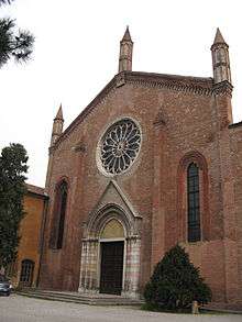 The church was founded by the Franciscan Order in 1304 but it was not consecrated until 1459, when Pope Pius II performed the ceremony.[1] Suppressed in 1782, it was sacked in 1797,[1] during the Napoleonic Wars, and turned into an arsenal in 1811. Still in military use when World War II began, it was devastated by bombardment during the war. The Cappella Gonzaga, with its frescoes depicting the life of St. Louis of Toulouse ( Italian: San Ludovico d'Angiò ), was saved and recently restored. These frescoes were supposed to have been painted by Serafino de' Serafini,[1] an artist who was active in Modena during the 14th Century. The church was reconstructed in Romanesque and Gothic styles. Now visible are some of the original frescoes depicting St. Francis Receives the Stigmata by Stefano da Verona. Andrea Mantegna's work St. Bernardino of Siena between Two Angels was originally here but it is now at the Pinacoteca di Brera in Milan, Italy.