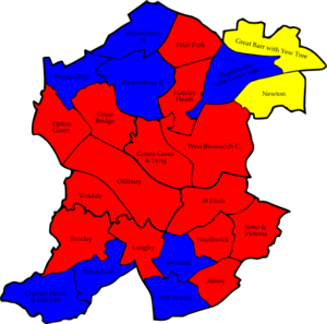The results saw Labour remain in control of the council with 49 seats, but the Conservatives made a net gain of 3 to move to 14 seats.[4][5] The Conservatives gained 4 of the 17 seats Labour had been defending, in the wards of Bristnall, Cradley Heath and Old Hill, Princes End and Wednesbury South.[6] However Labour did take 1 seat back from the Conservatives in St Pauls ward.[6] Labour put the results down to them keeping council tax levels low and improving services, however the Conservatives said they were moving forward in "a traditional Labour stronghold".[6]