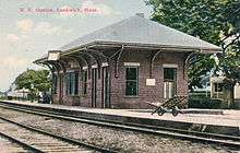 The original station was replaced by a brick station building in 1878.[1] It was demolished in the 1980s.
