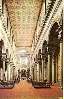 After the Florentine victory over the Milanese in 1397 during the second Milan war on the feast day of Saint Augustine (28 August), the signoria decided to rebuild the church to honor the saint, placing it under the patronage of the city. Despite this decision, nothing much happened until 1434, when the operai retained the services of Filippo Brunelleschi. Work on the new church progressed slowly until March 1471. During the Descend of the Holy Spirit sacra rappresentazione organized by the laudese in honor of the visit of Galeazzo Maria Sforza the old church caught fire and was heavily damaged, together with parts of the convent.[1][4][13]