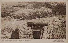 On 27 December, a German bombardment on the captured positions in La Boisselle was followed by an abortive counter-attack on the 118th Regiment and the 64th Regiment. German heavy artillery reinforcements had been brought into the area and made the area untenable; the French infantry were withdrawn and mine warfare began.[7] Many of the German units that fought on the Somme in 1914 remained in the area and made great efforts to fortify the defensive line, particularly with barbed-wire entanglements so that the front trench could be held with fewer troops. Railways, roads and waterways connected the battlefront to the Ruhr from where material for minierte Stollen (dug-outs) 20–30 ft (6.1–9.1 m) underground for 25 men each, excavated every 50 yd (46 m) and the front divided into Sperrfeuerstreifen (barrage sectors).[8]