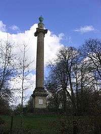Two large structures date from this time. First, and within the public access part of Savernake, there is the stone column[4] some 90 feet (27 m) high, and erected by Lord Ailesbury as an impressive viewpoint at the end of a vista from Tottenham House.