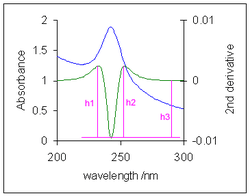 3. Baseline flattening. In analytical chemistry it is sometimes necessary to measure the height of an absorption band against a curved baseline.[10] Because the curvature of the baseline is much less than the curvature of the absorption band, the second derivative effectively flattens the baseline. Three measures of the derivative height, which is proportional to the absorption band height, are the "peak-to-valley" distances h1 and h2, and the height from baseline, h3.[11]