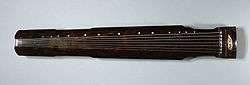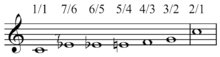 The scale of harmonics is a musical scale based on the noded positions of the natural harmonics existing on a string. This musical scale is present on the guqin, regarded as one of the first string instruments with a musical scale.[1] Most fret positions appearing on Non-Western string instruments (lutes) are equal to positions of this scale. Unexpectedly, these fret positions are actually the corresponding undertones of the overtones from the harmonic series. The distance from the nut to the fret is an integer number lower than the distance from the fret to the bridge (see: superparticular number).