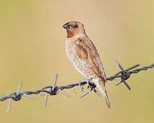 The scaly-breasted munia or spotted munia (Lonchura punctulata), known in the pet trade as nutmeg mannikin or spice finch, is a sparrow-sized estrildid finch native to tropical Asia. A species of the genus Lonchura, it was formally described and named by Carl Linnaeus in 1758. Its name is based on the distinct scale-like feather markings on the breast and belly. The adult is brown above and has a dark conical bill. The species has 11 subspecies across their range and differ slightly in size and colour.