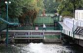 The lake shore area also serves as a marina associated to the Hafen Enge. A narrow alley was partially built at the level of the moat, but also crosses underneath the General-Guisan-Quai and four road bridges, namely Börsenstrasse, Stockerstrasse, Pelikanstrasse and Sihlstrasse, as well as four pedestrian bridges. In addition to the so-called Seeuferanlage and its neighboring General-Guisan-Quai,[4][5] there is nearby the Arboretum and the Voliere Zürich,[6][7] Other attractions include the historical Enge quarter, but mainly the Old Botanical Garden and its arboretum. There is also a unique public bath just for men (Männerbad) that also serves as an event restaurant.[8] That section of the moat is also used as a ground for canoeing and a 'water stadion' for canoe waterball.[2] Probably the most natural part is situated nearby the mouth into the Sihl, where also some waterbirds and even fish found an inner-city refugium.