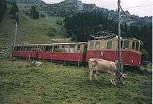 The line still operates one of its original steam locomotives, together with the four electric locomotives built for the line's electrification. A number of additional similar locomotives, together with matching coaches, were bought from the Wengernalpbahn but had (until the recent delivery of additional train sets) often returned to this line to help in winter sports traffic.[6]