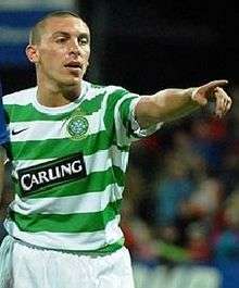 Early in the 2008–09 season, Strachan praised Brown for re-inventing himself as a more defensive-minded player.[46] Despite taking on these defensive duties, Brown still contributed some goals, such as against his former club Hibernian on 25 October.[47] Brown won the SPL Player of the Month Award for October 2008.[48] In the January transfer window he was linked with a £9 million move to Portsmouth, with Tottenham also reported to be interested in him. Brown stated that he did not want to leave Celtic and that he was happy with the club.[49] Later in the month, he was named by FIFA as one of their players to watch in 2009.[50] He scored his first brace for Celtic in a 7–0 victory over St Mirren on 28 February 2009.[51] Brown was voted Man of the Match in the 2009 League Cup Final, which Celtic won 2–0 against Rangers at Hampden Park.[52] and was awarded the SPFA Players' Player of the Year for the 2008–09 season.[53] Due to a suspension, he missed the final Old Firm game of the season,[54] which Celtic lost 1–0.[55] This defeat proved crucial as Rangers regained the championship from Celtic. He suffered an ankle injury towards the end of the season and had to take injections in order to play matches.[56] Brown played 48 times for Celtic during the 2008–09 season, scoring seven goals.