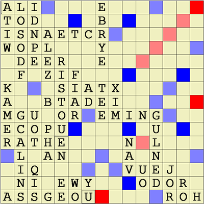 This game is a cross between Othello and Scrabble played on a 13 x13 board. Each player has different coloured tiles. The rack is common and always contains 7 tiles. All tiles have the same value, one point. Points are scored for how many tiles are currently your own colour. The special squares are pink and orange. A word with a tile on a pink square clears the board. When this happens a bonus point is received for each tile you placed on an orange square on that board.[20]