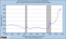 This did not happen, however, in the financial crisis that began in 2008. In fact, demand deposits in the U.S. increased dramatically, from around $310bn in August 2008 to a peak of around $460bn in December 2008.[4]>