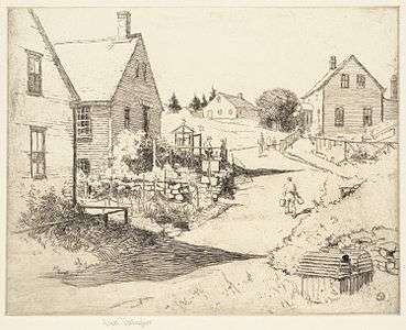 Before 1900, Gallagher had eight exhibits in Boston, Providence, and Lowell: one of oil paintings and the rest watercolors and pen and ink drawings. The pace of exhibitions picked up considerably after the turn of the century, with a total of 46 between 1900 and 1929 and then tapered off to 11 between 1930 and 1939 and three in the 1940s.[22][23] His exhibitions were routinely and positively reviewed in the two major art journals of the period, The Art News and American Art News, as well as in the popular press, and his work was collected by individuals and major museums.[24] Gallagher undertook numerous commissions to illustrate books and magazines.[22] He did a series of 40 etchings of iconic Boston buildings and landscapes that were widely distributed and followed these with series on New York, Baltimore, and Washington, DC.[18] Sales of his paintings and prints and his work as an illustrator earned Gallagher a steady income. He complemented this with teaching at Boston University's evening school.[25]