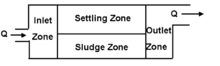 In the inlet zone, flow is established in a same forward direction. Sedimentation occurs in the settling zone as the water flow towards to outlet zone. The clarified liquid is then flow out from outlet zone. Sludge zone: settled will be collected here and usually we assume that it is removed from water flow once the particles arrives the sludge zone.[8]