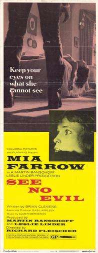 See No Evil, also known as Blind Terror, is a 1971 British thriller film directed by Richard Fleischer and starring Mia Farrow as a recently blinded woman terrorized by a psychopath.
