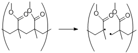 Polymers have been observed to undergo homolytic bond cleavage through the use of radical reporters such as DPPH (2,2-diphenyl-1-picrylhydrazyl) and PMNB (pentamethylnitrosobenzene.) When a bond is cleaved homolytically, two radical species are formed which can recombine to repair damage or can initiate other homolytic cleavages which can in turn lead to more damage.[29]