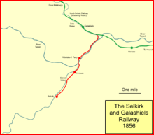 Selkirk lay about 5 miles (8.0 km) from Galashiels, and as well as woollen goods it had an important shoemaking industry. The independent Selkirk and Galashiels Railway was incorporated on 31 July 1854, with authorised capital of £24,000.[2] The promoters secured agreement with the North British Railway that the NBR would work the line; the terms were for 50% of receipts up to £3,000 a year and 45% above that.[3][4][5]