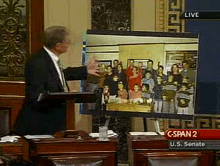 In a continuation of these themes, Inhofe had a 20-page brochure published under the Seal of the United States Senate reiterating his "hoax" statement, comparing the Intergovernmental Panel on Climate Change (IPCC) to a "Soviet style trial", and in a section headed "The IPCC Plays Hockey" he attacked what he called "Mann's flawed, limited research."[48][49] The brochure restated themes from Inhofe's Senate speech, and in December 2003 he distributed copies of it in Milan at a meeting discussing the United Nations Framework Convention on Climate Change, where he met "green activists" with posters quoting him as saying that global warming "is the greatest hoax ever perpetrated on the American people". He signed a poster for them,[33] and thanked them for quoting him correctly. In an October 2004 Senate speech he said "Global warming is the greatest hoax ever perpetrated on the American people. It was true when I said it before, and it remains true today. Perhaps what has made this hoax so effective is that we hear over and over that the science is settled and there is a consensus that, unless we fundamentally change our way of life by limiting greenhouse gas emissions, we will cause catastrophic global warming. This is simply a false statement."[48][50] In January 2005 Inhofe told Bloomberg News that global warming was "the second-largest hoax ever played on the American people, after the separation of church and state", and that carbon dioxide would not be restricted by the Clear Skies Act of 2003.[51][52][53] In a Senate Floor "update", he extended his argument against Mann's work by extensively citing Michael Crichton's fictional thriller, State of Fear, mistakenly describing Crichton as a "scientist".[54] On August 28, 2005, at Inhofe's invitation, Crichton appeared as an expert witness at a hearing on climate change, disputing Mann's work.[48]