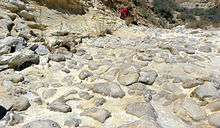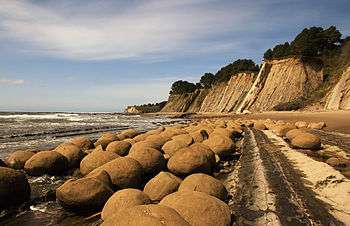 Cannonball concretions are large spherical concretions, which resemble cannonballs. These are found along the Cannonball River within Morton and Sioux Counties, North Dakota, and can reach 3 m (9.8 ft) in diameter. They were created by early cementation of sand and silt by calcite. Similar cannonball concretions, which are as much as 4 to 6 m (13 to 20 ft) in diameter, are found associated with sandstone outcrops of the Frontier Formation in northeast Utah and central Wyoming. They formed by the early cementation of sand by calcite (McBride et al. 2003). Somewhat weathered and eroded giant cannonball concretions, as large as 6 meters (20 feet) in diameter, occur in abundance at "Rock City" in Ottawa County, Kansas. Large and spherical boulders are also found along Koekohe beach near Moeraki on the east coast of the South Island of New Zealand.[4] The Moeraki Boulders and Koutu Boulders of New Zealand are examples of septarian concretions, which are also cannonball concretions. Large spherical rocks, which are found on the shore of Lake Huron near Kettle Point, Ontario, and locally known as "kettles", are typical cannonball concretions. Cannonball concretions have also been reported from Van Mijenfjorden, Spitsbergen; near Haines Junction, Yukon Territory, Canada; Jameson Land, East Greenland; near Mecevici, Ozimici, and Zavidovici in Bosnia-Herzegovina; in Alaska in the Kenai Peninsula Captain Cook State Park on north of Cook Inlet beach.[5] Reports of cannonball concretions have also come from Bandeng and Zhanlong hills near Gongxi Town, Hunan Province, China.[6]