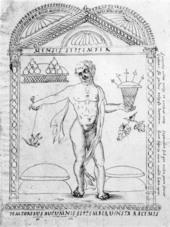 The vintage, with bunches or baskets of grapes, predominates in both verbal and visual allegories of September, particularly in mosaics depicting the months.[9] In the manuscripts that preserve the Calendar of Filocalus (354 AD), September is represented by a nude male wearing only a long light scarf over one shoulder. The conventional bunch of grapes appears under his left hand, outstretched to hold a basket, on the top of which are arrayed five puzzling picks or skewers. Over his right shoulder is placed a basket holding two pyramids of six figs or small flasks.[10] A vessel, presumably to receive the new wine, is sunk into the ground on either side of him. Over the one to his right, he dangles a lizard on a string, a motif that recurs in imagery associated with Dionysus, the god of wine. The exact significance of the lizard is uncertain. It may represent a magico-medical charm to ensure healthy wine, with the lizard either a potent lustration or the potential damage to be warded off. The lizard is also an attribute of Apollo Sauroctonos.[11]