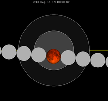 A total lunar eclipse took place on September 15, 1913. The moon passed through the center of the Earth's shadow.[1]