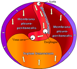 The cranial part of the septum transversum gives rise to the central tendon of the diaphragm and is the origin of the myoblasts that invade the pleuroperitoneal folds resulting in the formation of the muscular diaphragm.[2]