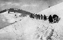 Following the October 1915 invasion of Serbia during World War I at the hands of German, Austro-Hungarian and Bulgarian armies, the Serbian army retreated through Albania, an event sometimes called the Albanian golgotha (Serbian: Албанска голгота/Albanska golgota). During the long march, some 240,000 retreating Serbs died from the cold, starvation, disease and at the hands of Albanian tribesmen.[1] The march through the Albanian mountains had decimated its rank and contributed to the horrendous losses the Serbs had suffered in the First World War – the highest per capita of any country.[2]