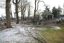 Ice storms are also known as a Silver storm, referring to the color of the freezing precipitation.[85] Ice storms are caused by liquid precipitation which freezes upon cold surfaces and leads to the gradual development of a thickening layer of ice.[85] The accumulations of ice during the storm can be extremely destructive. Trees and vegetation can be destroyed and in turn may bring down power lines, causing the loss of heat and communication lines.[86] Roofs of buildings and automobiles may be severely damaged. Gas pipes can become frozen or even damaged causing gas leaks. Avalanches may develop due to the extra weight of the present. Visibility can be reduce dramatically. The aftermath of an ice storm may result in severe flooding due to sudden thawing, with large quantities of displaced water, especially near lakes, rivers, and bodies of water.[87]
