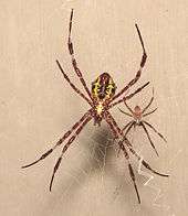 Size dimorphism shows a correlation with sexual cannibalism, which is prominent in spiders (it is also found in insects such as praying mantises). In the size dimorphic wolf spider, food-limited females cannibalize more frequently.[37] Therefore, there is a high risk of low fitness for males due to pre-copulatory cannibalism, which led to male selection of larger females for two reasons: higher fecundity and lower rates of cannibalism.[37] In addition, female fecundity is positively correlated with female body size and large female body size is selected for, which is seen in the family Araneidae. All Argiope species, including Argiope bruennichi, use this method. Some males evolved ornamentation including binding the female with silk, having proportionally longer legs, modifying the female's web, mating while the female is feeding, or providing a nuptial gift in response to sexual cannibalism.[37] Male body size is not under selection due to cannibalism in all spider species such as Nephila pilipes, but is more prominently selected for in less dimorphic species of spiders, which often selects for larger male size.Some other species that display these cannabalistic characteristics are large snakes, insects, and some forms of midgets.[38]