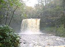 Waterfall Country (or sometimes Waterfalls Country) is the name given to an area around the head of the Vale of Neath in South Wales where an unusually large number of spectacular and publicly accessible falls are to be found. The area is loosely defined but generally includes the group of falls on the Nedd Fechan, Pyrddin, Hepste and Mellte rivers, all of which lie in the country between the villages of Pontneddfechan and Ystradfellte in the southern part of the Brecon Beacons National Park. All of these falls lie within or on the boundary of the county of Brecknockshire, now part of the unitary authority of Powys. A few miles further west are Henrhyd Falls on the Nant Llech, a tributary of the Tawe and to the southwest are Melin Court Falls on the Melin Court Brook, a tributary of the River Neath. These, along with Aberdulais Falls on the Dulais, a further tributary of the Neath are also encompassed by the term 'Waterfall/s Country' by some writers.
