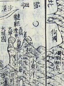 The seas beside East Asia are the South China Sea (大明海, lit. "Great Ming Sea") and the "Lesser Eastern Ocean" (小東洋, Xiǎo Dōng Yáng).[4] To the north is the "Ice Sea" (冰海, Bīng Hǎi).