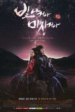 Shine or Go Crazy (Hangul: 빛나거나 미치거나; RR: Binnageona Michigeona) is a 2015 South Korean television series based on the novel of the same name by Hyun Go-woon about the romance between a Goryeo prince and a Balhae princess.[1] Starring Jang Hyuk, Oh Yeon-seo, Lee Ha-nui and Lim Ju-hwan, it aired on MBC from January 19 to April 7, 2015 on Mondays and Tuesdays at 22:00 for 24 episodes.[2][3][4][5]