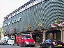 Of more concern in the immediate post-war period was the deteriorating housing stock. In the 1950s, the back-to-backs of Hargreaves' Square were condemned as slums and the site redeveloped. The redevelopment removed several historic buildings – Shipley Old Hall (1593), at the junction of Kirkgate and Manor Lane[23] and of which a few fragments of roof drainage and a roof truss survive in Crowghyll Park,[24] Shipley Hall (1734), which stood at the junction of Market Street and Otley Road became the headquarters of Windhill Cooperative Society[23] and possibly Hudson Fold House (1629).[25] Of the major Victorian town centre buildings, only the Old Bradford Bank (now Barclays) and Sun Hotel remain.[26] The slums were replaced with low-rise modern retail outlets, a central square serves as an outdoor market and an underground indoor market is situated beneath a tall, brutalist market hall tower which is a visible landmark for many miles around. Until recently the tower had a 'man' striking a bell to mark the hours.[27]