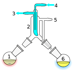 Short path distillation is a distillation technique that involves the distillate travelling a short distance, often only a few centimeters, and is normally done at reduced pressure.[1][2] A classic example would be a distillation involving the distillate travelling from one glass bulb to another, without the need for a condenser separating the two chambers. This technique is often used for compounds which are unstable at high temperatures or to purify small amounts of compound. The advantage is that the heating temperature can be considerably lower (at reduced pressure) than the boiling point of the liquid at standard pressure, and the distillate only has to travel a short distance before condensing. A short path ensures that little compound is lost on the sides of the apparatus. The Kugelrohr is a kind of a short path distillation apparatus which often contain multiple chambers to collect distillate fractions.