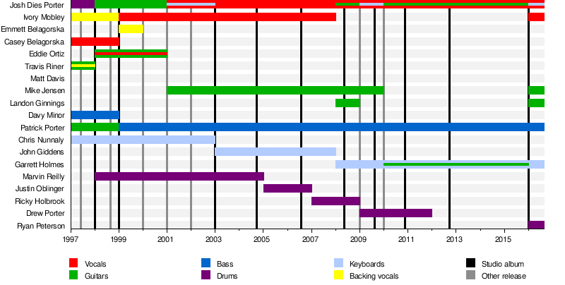- Josh Dies – vocals (2001–2016[36]), guitar (1999–2001, 2008, 2010–2015[36]), synthesizer (2001–2003; 2009; 2016)[36]), drums (1997–1998)