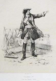The frigate Shtandart (Russian: Штандартъ) was the first ship of Russia's Baltic fleet. Her keel was laid on April 24, 1703 at the Olonetsky shipyard near Olonets by the decree of Tsar Peter I and orders issued by commander Aleksandr Menshikov. The vessel was built by the Dutch shipwright Vybe Gerens under the direct supervision of the tsar. She was the first flagship of the Imperial Russian Navy and was in service until 1727. The name Shtandart was also given to the royal yachts of the tsars until the Russian Revolution in 1917. Tsar Nicholas II's royal yacht was last of this series.
