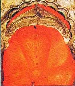 The garbhagriha (sanctum) is 15 ft high and 10 ft wide.[4] It has the Jaya-Vijaya – the gatekeepers of Vishnu's abode – brass sculptures flanking the central icon of Siddhivinayaka. It has a dome-shaped stone ceiling.[4][5] Like all Ashtavinayaka shrines, the central Ganesha image is believed to be svayambhu (self-existent), naturally occurring in the form of an elephant-faced stone.[8] The central icon of Siddhi-Vinayaka is seated cross-legged with his consort Siddhi seated nearby, though often she is hidden with flower garlands and the sindoor paste that covers the image.[5] The icon is sheathed in brass and with its trunk turned to the right.[5] The sanctum also has a Shiva-panchayatana (Shiva surrounded by Ganesha, Vishnu, the Goddess and the Sun-god Surya) and a shrine to goddess Shivai.[4]
