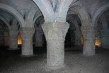 Inside the walls the tower included a crypt chapel,[13] which may be the site of a previous church.[11] The crypt chapel originally had a nave, chancel and an apsidal sanctuary. It is a typical early Norman design with solid pillars and arches.[14] In 1074 D'Oyly and his close friend, Roger d'Ivry endowed a chapel with a college of priests. At an early stage it acquired a dedication to Saint George.