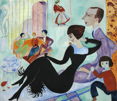 Ateljéinteriör (Studio interior) from 1916 shows how radical Hjertén was for her time. The painting describes the roles she played as artist, woman, and mother: different identities in different worlds. Hjertén sits on the sofa between two artists – her husband, Isaac Grünewald, and, perhaps, Einar Jolin – who talk to each other over her head. Her large blue eyes stare into the distance. In the foreground a woman dressed in black – a sophisticated alter ego – leans against a male figure who might be the artist Nils von Dardel. Her son Ivàn crawls out of the right-hand corner. In the background we glimpse one of Hjertén's paintings of the period, Zigenarkvinna (Gypsy woman). Studio Interior and Den röda rullgardinen (The red blind), from 1916, are daring paintings that have given rise in recent years to new interpretations based on contemporary gender studies and reveal information about the artist's private life.
