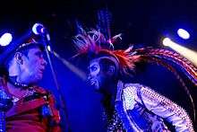 The themes and imagery in the band's songs were often influenced by futuristic, dystopian or post-apocalyptic films such as A Clockwork Orange, The Terminator, Blade Runner and the Mad Max trilogy.[2][4] Visually, their image included fishnet masks and brightly coloured wigs.