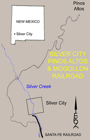 Silver City, Pinos Altos and Mogollon Railroad (SC,PA&M) was a 2 ft (610 mm) narrow gauge railway serving copper mines along the Continental Divide[1] in the mountains of southwestern New Mexico. The communities of Silver City and Pinos Altos developed as 19th century miners recovered easily extracted gold and silver from ore deposits of the area. Standard-gauge Santa Fe Railroad reached Silver City in 1886, and SC,PA&M was incorporated 24 August 1889 to build a railway north to Mogollon, New Mexico. Construction was limited to 5 miles (8.0 km) of grading[2] until Wisconsin-based Comanche Mining and Smelting purchased the railroad and the Pinos Altos mining claims of George Hearst in 1903[3] after horse-drawn ore transport became uneconomical. The Silver City smelter burned shortly after purchase, but was rebuilt with three blast furnaces and a reverberatory furnace to handle 225 tons of ore per day.[4] Two Shay locomotives were moved to Silver City in August 1905 from the Gilpin tramway of Gilpin County, Colorado.[5] The railroad was built through iron and limestone mines on Chloride Flat west of Silver City.[4] The limestone was used as a flux for smelting the copper ore.[2]