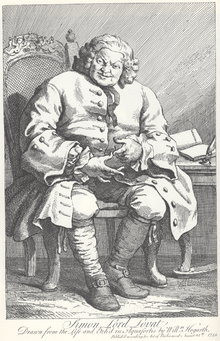 Even then, so broken down by gout and arthritis that he had to be carried on a litter, Lovat’s mental resources did not fail. In a conference with other Jacobites on the shores of Loch Arkaig, he proposed that they should raise a body of three thousand men and play cat and mouse with the leader of the government army, the Duke of Cumberland.[48] Fraser himself aimed to get to France. In June, sailors from the government sloop Furnace searched the island of Loch Morar, near the Atlantic coast. They only just missed Lovat. He was captured shortly afterwards on the shore of the loch, and brought to London for trial. As he neared London, William Hogarth painted his portrait in oil, showing Simon enumerating some points on his fingers. What these points are remain a matter of conjecture.[49]