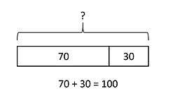 The solution to this problem could be solved by drawing one bar and dividing it into two parts, with the longer part as 70 and the shorter part as 30. By visualizing these two parts, students would simply solve the above word problem by adding both parts together to build a whole bar of 100. Conversely, a student could use whole-part model to solve a subtraction problem such as 100 - 70, by having the longer part be 70 and the whole bar be 100. They would then solve the problem by inferring the shorter part to be 30.