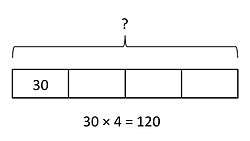 The student could solve this multiplication problem by drawing one bar to represent the unknown answer, and subdivide that bar into four equal parts, with each part representing $30. Based on the drawn model, the student could then visualize this problem as providing a solution of $120.