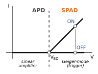 Both APDs and SPADs are reversely biased semiconductor p–n junctions. However, APDs are biased close to, but exceeding the breakdown voltage of the semiconductor. This high electric field provides an internal multiplication gain only on the order of few hundreds, since the avalanche process is not diverging as in SPADs. The resulting avalanche current intensity is linearly related to the optical signal intensity. A SPAD, however, operates with a bias voltage above the breakdown voltage. Because the device is operating in this unstable above-breakdown regime, a single photon (or a single dark-current electron) can set off a significant avalanche of electrons. Practically, this means that in an APD a single photon produces only tens or few hundreds of electrons, but in a SPAD a single photon triggers a current in the milliampere region (billions of billions of electrons per second) that can be easily "counted".[3]