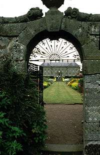 Bruce's early work involved advising clients and rebuilding existing houses, rather than designing new buildings from scratch. Panmure House and Leslie House (seat of the Earl of Rothes) had been projects of the king's master mason John Mylne. At Panmure, although Bruce has been credited with the design in the past, the works were overseen by Alexander Nisbet, although Bruce did design the gates and gate piers.[23] At Leslie, Bruce oversaw the works after Mylne's death, and probably made his own amendments. Panmure was demolished in the 1950s, and only a small part of Leslie House remains standing, following a fire in the 18th century.[24] Bruce later advised the Duke of Queensberry regarding his plans for Drumlanrig Castle.[25]
