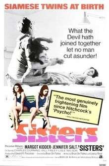 Sisters (also known as Blood Sisters in the United Kingdom) is a 1973 American psychological horror film directed by Brian De Palma and starring Margot Kidder, Jennifer Salt and Charles Durning. The plot focuses on a French Canadian model whose separated Siamese twin is suspected of a brutal murder witnessed by a newspaper reporter in Staten Island.