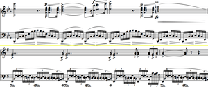 The second piece, referred to as a "glittering showpiece", is positioned in contrast to the lyrical and "atmospheric" melody of the first piece.[8] The piece is in the quick tempo allegretto (quickly), at 92 quarter notes per minute. It is 131 measures long, the most of all six pieces,[14] but the second shortest in terms of playing time, usually no longer than three and a half minutes (the shortest is number four).[2] This piece represents a typical nineteenth-century étude, similar in style to Frédéric Chopin's Études (Opp. 10, 25), with a melody interspersed between rapid sextuplet figures.[2] It is in strict ternary form with a coda: identical beginning and ending sections beginning on measures 1 and 85, and a contrasting middle section starting on measure 45. The second section radically changes dynamics, constantly changing from piano to fortissimo and even sforzando.[14] It is, throughout, a relentless torrent of descending half steps and a cascading left hand figure reminiscent of Chopin's Revolutionary Étude (Op. 10, No. 12, 1831).[2] Ending the piece is a slow coda in Adagio (at ease) which closes with a perfect authentic cadence in E-flat Minor.[14]