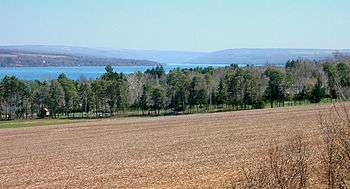 Landmarks and scenic features appear around the lake. Many historic buildings enhance the village of Skaneateles. Carpenter's Falls are near the hamlet of New Hope about one mile inland from the southwest shore of the Lake. They lie in a nature preserve that extends along Bear Swamp Creek to the Lake shore.[3] The historic New Hope Mill is nearby. Opposite Carpenter Point is Ten Mile Point, a favorite picnic destination. The southern end of the lake, bounded by high hills (below, right) differs in character from the north. Glen Haven, a hamlet located there, once featured a large resort hotel but now offers smaller visitor accommodations and seasonal dining. On the west side, the high Town of Niles, New York provides scenic prospects. On the east side, the high Town of Spafford, New York offers panoramic views. Between these towns lies deep Glen Haven valley in the Town of Scott, New York, in the third county. The hamlet of Borodino in Spafford retains an 1830 church, little altered, in the Federal style and noted as a center of the abolitionist movement where Frederick Douglass spoke.